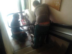 Most végre megvan a lift, s első sétám alkalmával, ami már kamera nélkül történt, kishíján lezúgtam a liftről, mert rosszul vettem be a kanyart, miközben a platóról próbáltam legurulni… Hála Istennek nem történt tragédia, mert apu időben megfogott… A térlátásom pocsék, mivel a szobai körülményekhez szoktam…